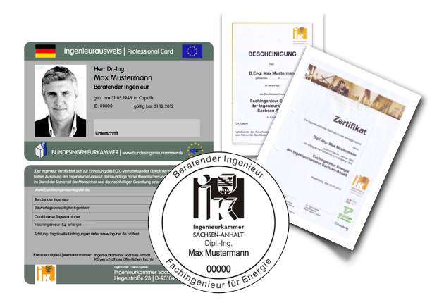 mit Urkunde, Listeneintrag bei der Ingenieurkammer Sachsen-Anhalt (Körperschaft des öffentlichen Rechts), Ausweis Fachingenieur und Rundstempel.